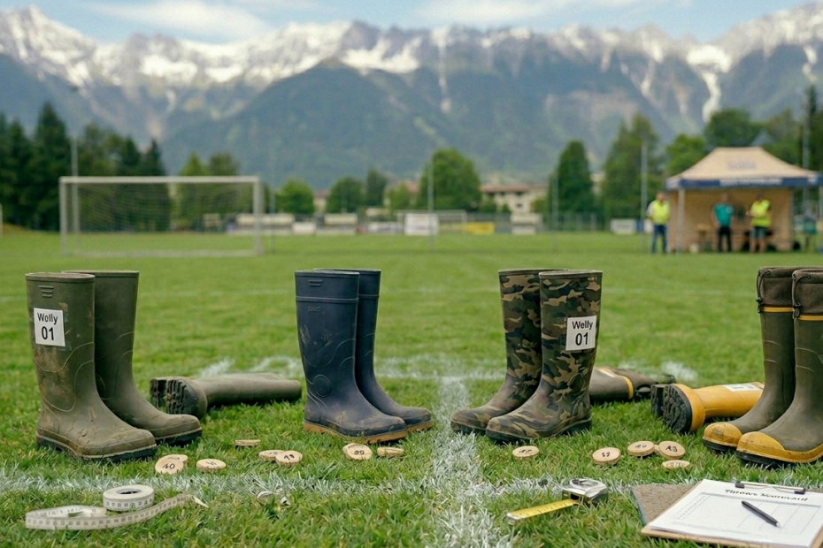 Gummistiefel-Weitwurf Ein Riesenspaß, bei dem die Stiefel rückwärts über den Kopf so weit wie möglich fliegen müssen.