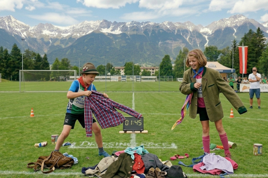 Trachten-Wettrüsten Kleidet ein Teammitglied im Eiltempo ein, während die Helfer jeweils nur eine Hand benutzen dürfen.